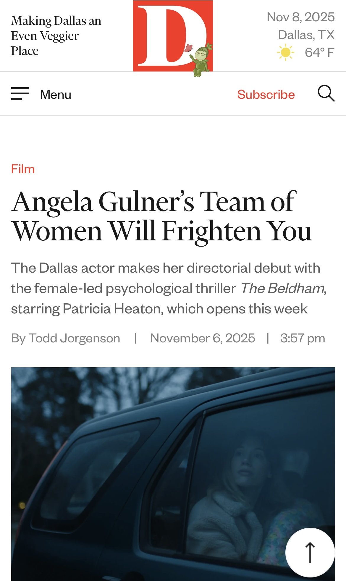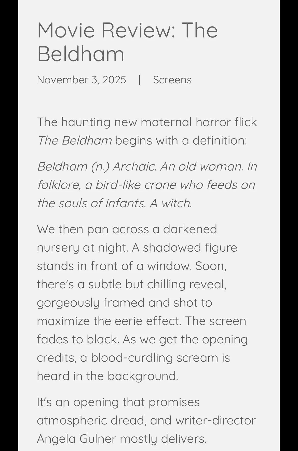 “With The Beldham, she (Gulner) has crafted a clever piece of writing whose ending recontextualizes the whole film in a magnetic flash…Embedded within this haunted house is a parable about inherited trauma, the uncommon joy and pain of motherhood, and how intrinsically we are connected to the earth.”