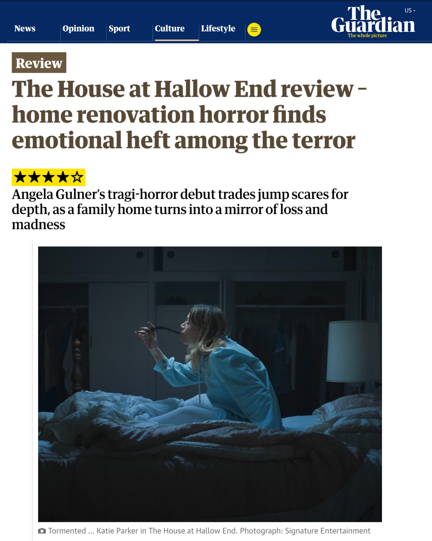 “Angela Gulner’s tragi-horror debut trades jump scares for depth, as a family home turns into a mirror of loss and madness.”