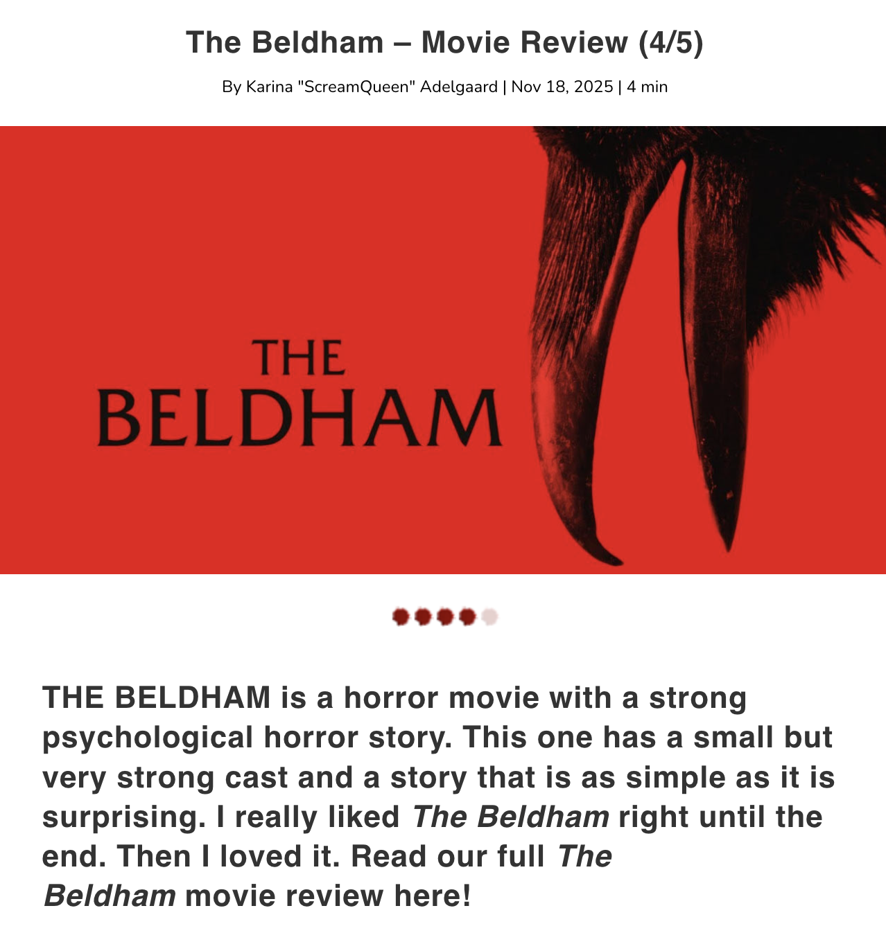 “THE BELDHAM is a horror movie with a strong psychological horror story. This one has a small but very strong cast and a story that is as simple as it is surprising. I really liked The Beldham right until the end. Then I loved it.”
